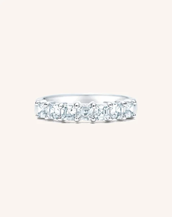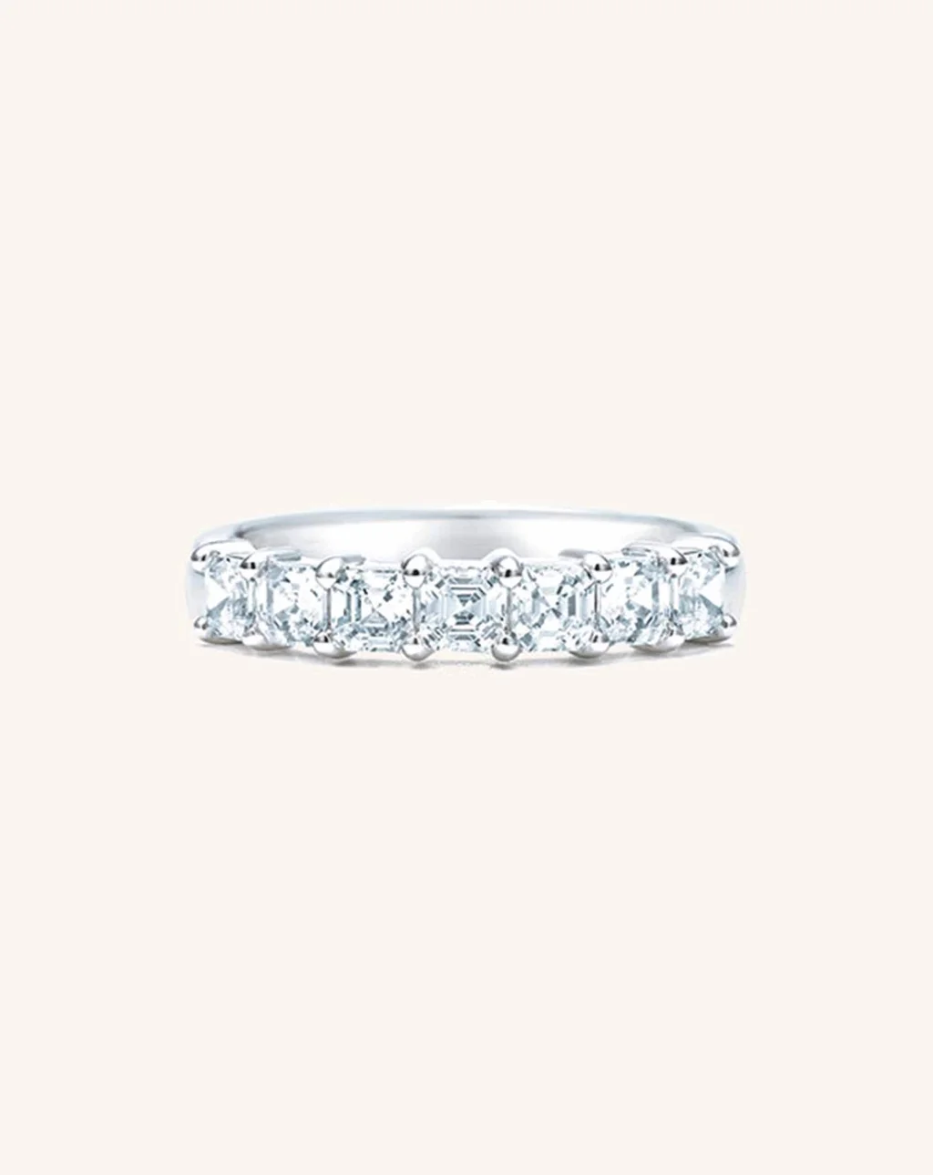 The Asscher cut diamond represents old-world sophistication. This particular shape embodies the essence of elegance and femininity. The perfect gift for that effortlessly chic, special someone.Seven asscher cut diamonds give this style a timeless class. The step-cut diamonds create a mesmerising lineup that will beautifully complement most styles of engagement rings or diamond bands.