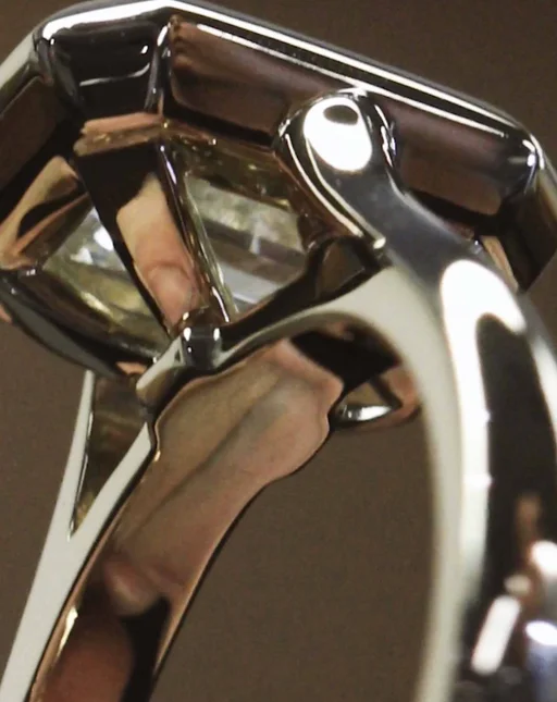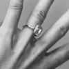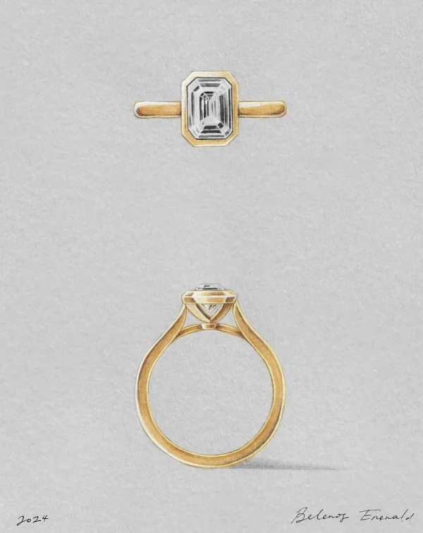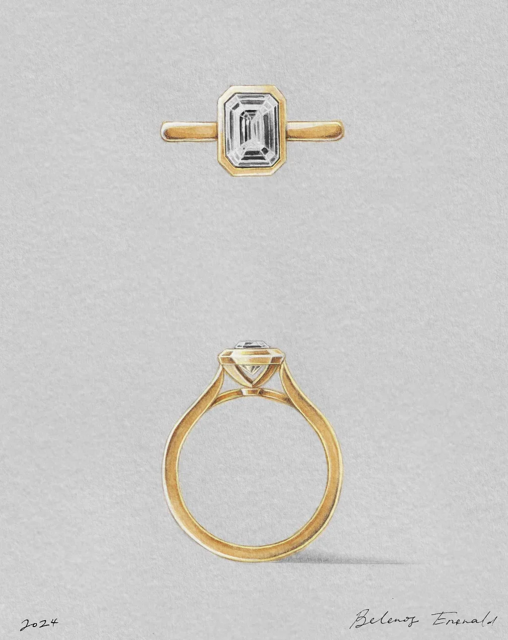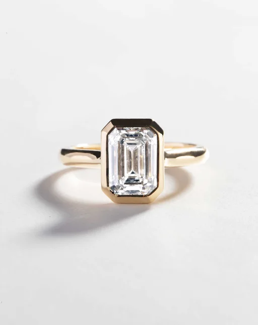 The Emerald Belenos solitaire is a contemporary silhouette for an old world diamond cut.The bezel setting is at the heart of the Belenos Collection, enveloping the central stone much like a frame would for a work of art. It serves to both safeguard the stone and allows its beauty to truly radiate. The setting is complemented with a soft swept-up rounded band, elegantly elevating the design to sit beautifully with a wedding band.