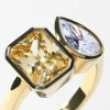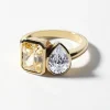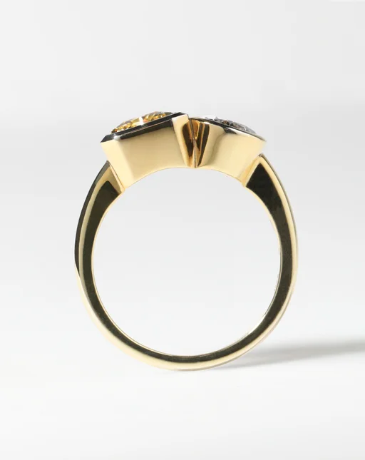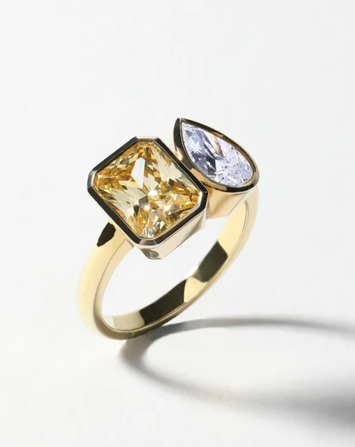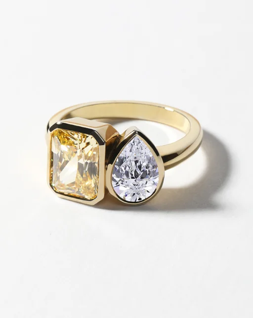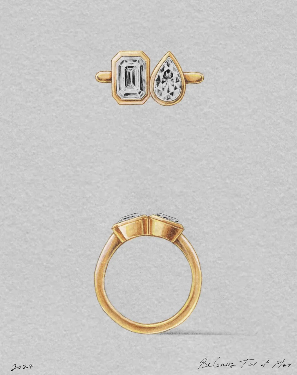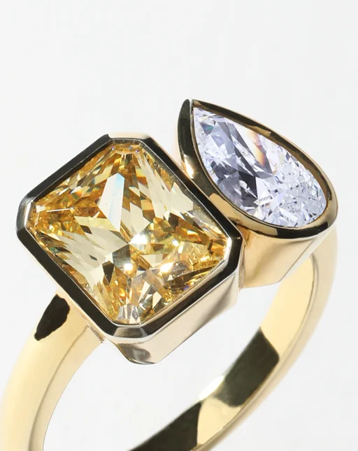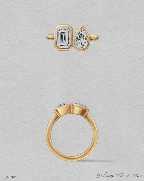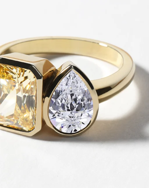 The Belenos Toi et Moi design is a playful duet of radiant-cut and pear-cut diamonds (or gemstones). A joyful representation of two souls side by side.The bezel setting is at the heart of the Belenos Collection, enveloping each stone much like a frame would for a work of art. It serves to both safeguard the stones and allows their beauty to truly radiate. The Belenos Toi et Moi is designed to sit low and comfortably on the finger with a soft half round band.