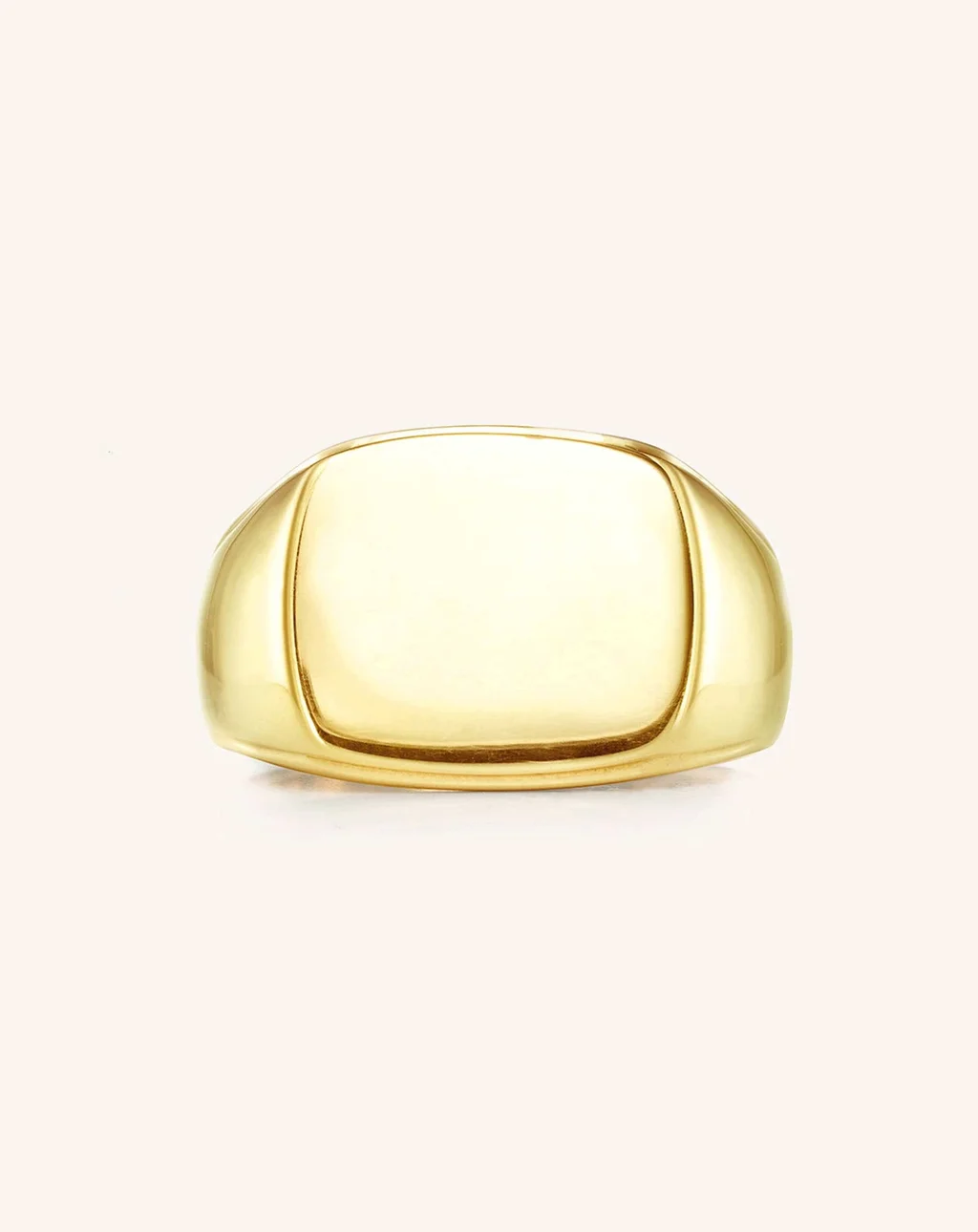 Shown in 18K yellow gold, Thickness: 3.6mm. Cushion signet ring with half-round profile band.