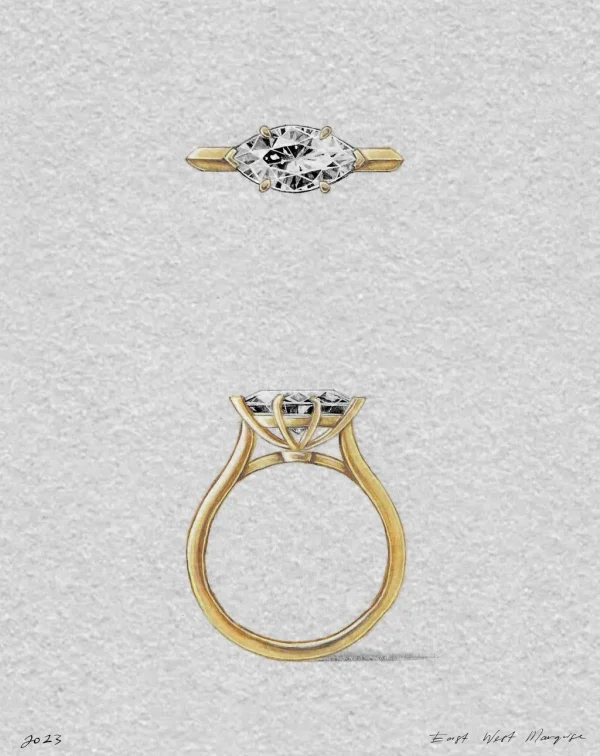 A contemporary interpretation of the classic marquise cut solitaire, setting the diamond on an East-West axis provides a distinct point of difference with considerable width across the finger.