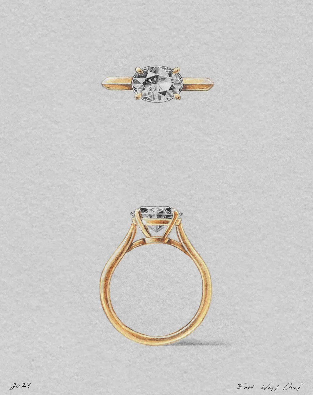 A contemporary interpretation of the classic oval solitaire, setting the diamond on an East-West axis provides a distinct point of difference with considerable width across the finger.