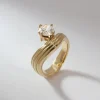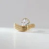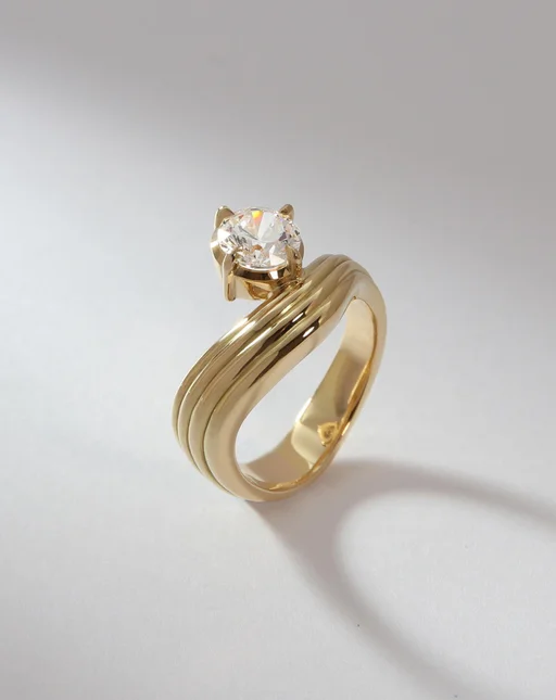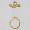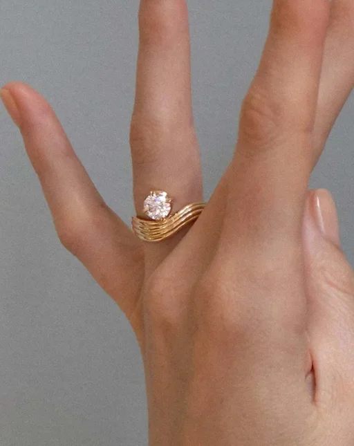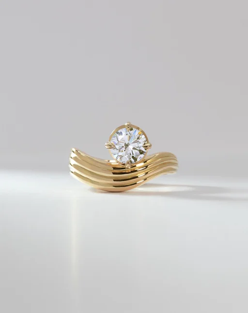 A contemporary classic, featuring an organic fluted band embracing an offset setting. The band’s rippling detail is designed to echo a shifting sand dune, a rippling tide, or rolling hills. A form to be imbued with your own connection to the landscape, a symbol of your shared and sacred happy place.