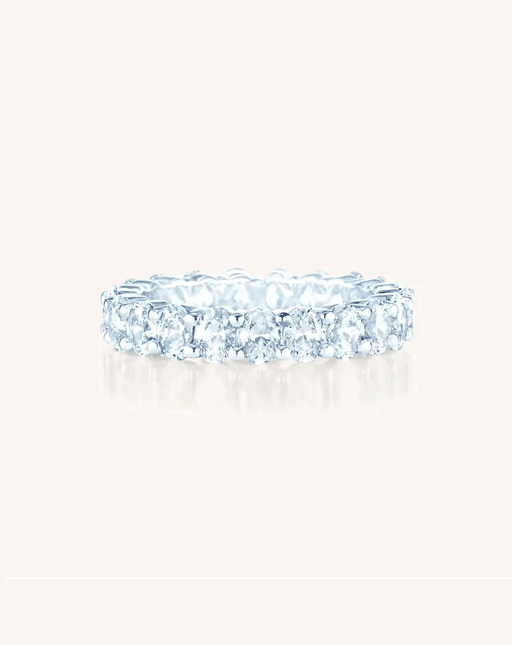 The oval cut diamond represents a risk-taker, someone who radiates individuality and creativity. The perfect gift for a person looking for something a little bit different. The oval diamonds set vertically give this style impressive breadth making it a dramatically dreamy addition to any finger.Diamonds set full eternity. Shown in 18K white gold. 4.0mm finished width.