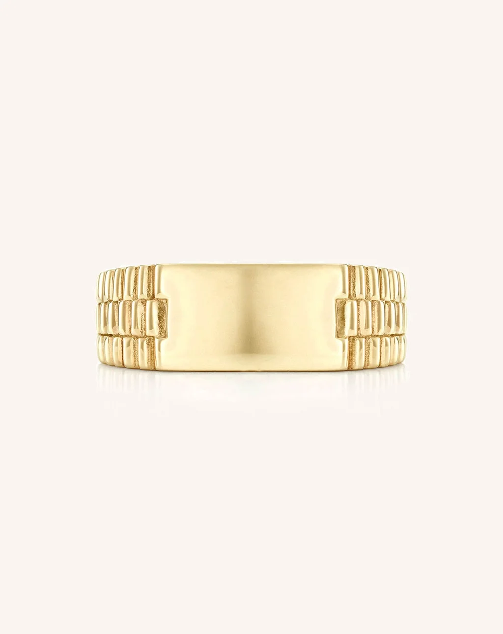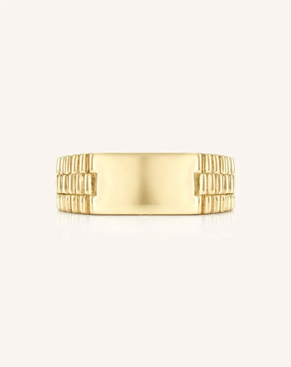A modern take on a classic flat band. With a flattened top, the Rectangular Tablet Ring is the perfect hybrid between a classic band and a signet style. The detail in the band offers a unique point of difference to our classic tablet ring design.Shown in 18K yellow gold, 7.3mm x 13.1mm rectangular tablet ring with a textured band. Thickness 2.5mm.