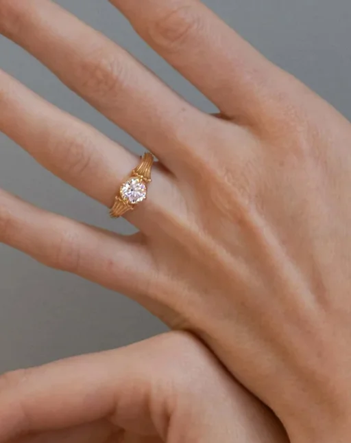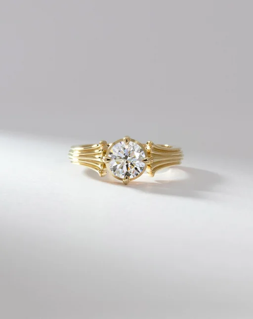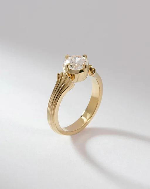 A contemporary classic, featuring a fluted band rising to meet the central setting. The band’s rippling detail is designed to echo a rushing tide.At the heart of the design is our signature Boussole setting, ready to be set with your choice of diamond or gemstone.