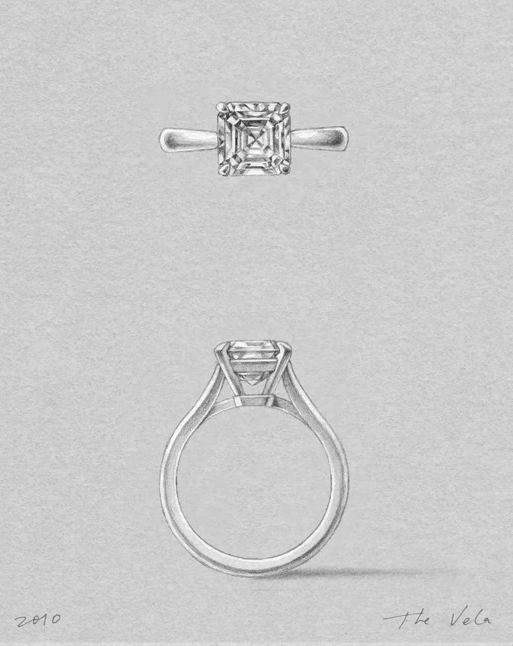 The Vela Setting showcases a mesmerising asscher cut Diamond in Platinum, enhanced by a gently tapered band and elegant four-claw setting.